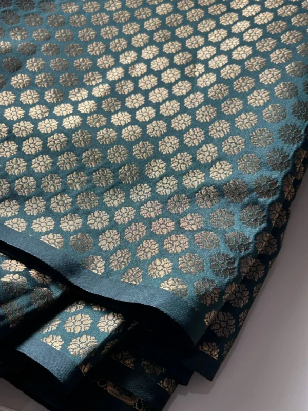 Add a touch of royal elegance to your creations with this teal brocade running fabric. Beautifully woven with intricate motifs and a soft luminous finish, this fabric blends tradition with timeless charm. The rich texture and structured drape make it ideal for lehengas, designer blouses, festive gowns, and statement ethnic outfits. Perfect for weddings, celebrations, and grand occasions, this brocade fabric brings sophistication and festive brilliance to every stitch.