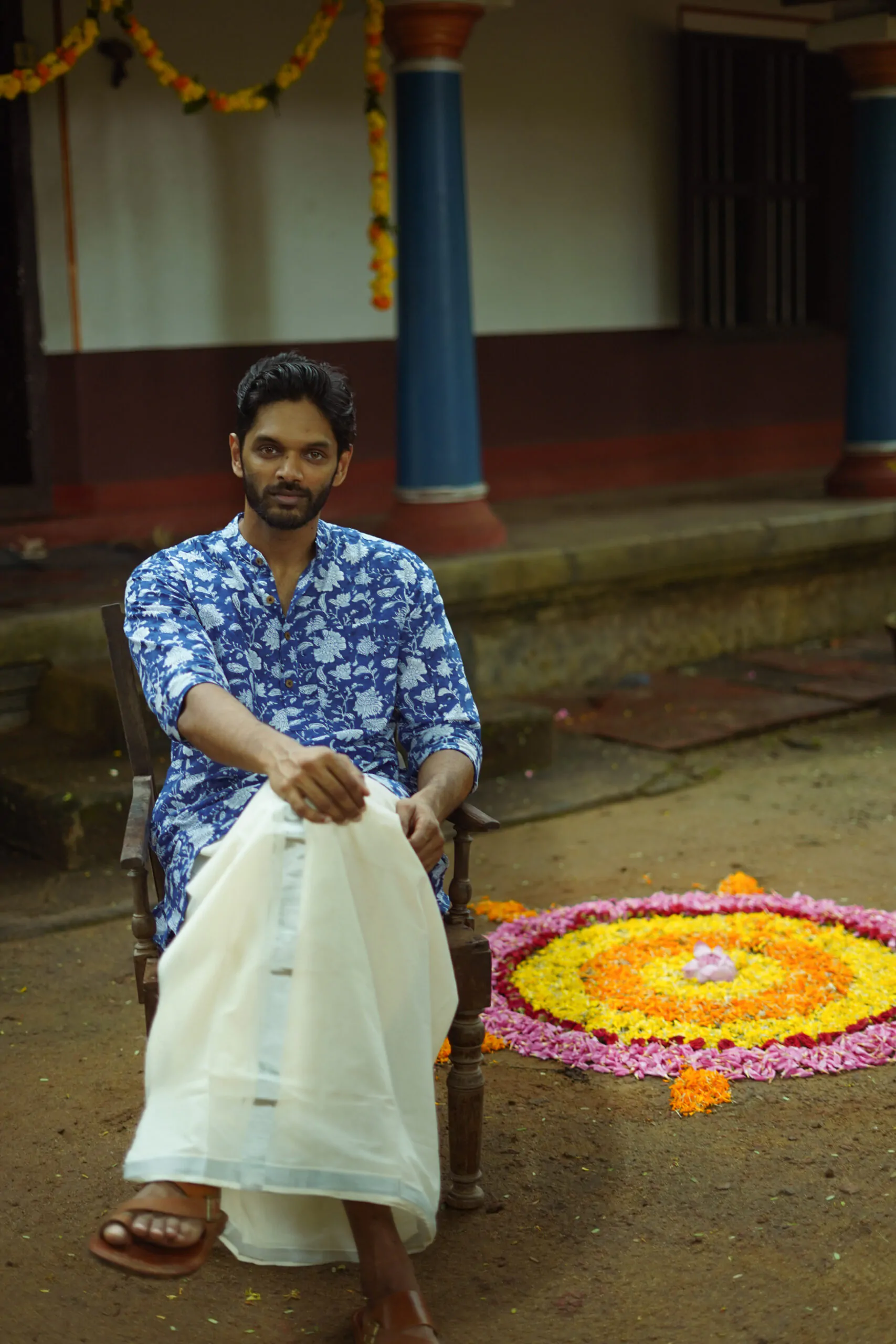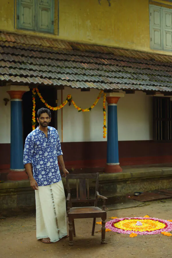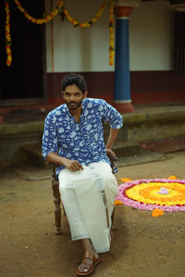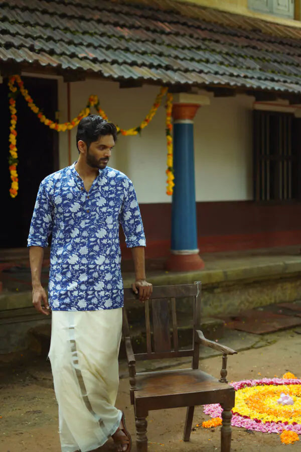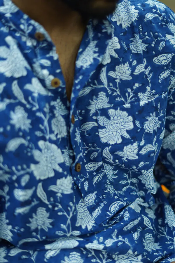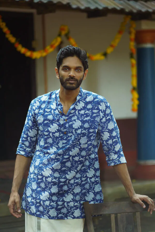 Introducing Men Indigo floral  Fit Kurta made with the finest material. This exquisite piece of craftsmanship comes from our Nirakottu Collection. Bring home a piece of modern Indian aesthetic. Explore more artisanal finds from our Kurta range.