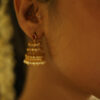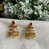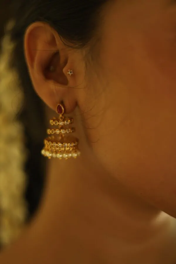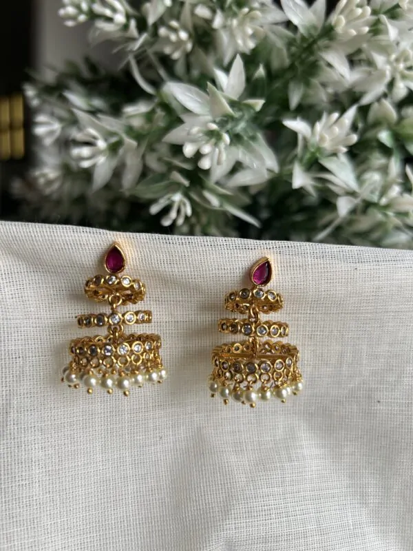 - Embrace elegance with these Ruby stud three Jhumka Earrings, a perfect addition for weddings and special occasions. The earrings feature a unique twisted design at the bottom, adding depth and texture to the traditional jhumka style. The top of each earring is adorned with aruby stone . The jhumka is beautifully finished with a row of pearls, creating a gentle sway with each movement. Crafted to perfection, these earrings embody the essence of South Indian heritage and artistry.
