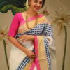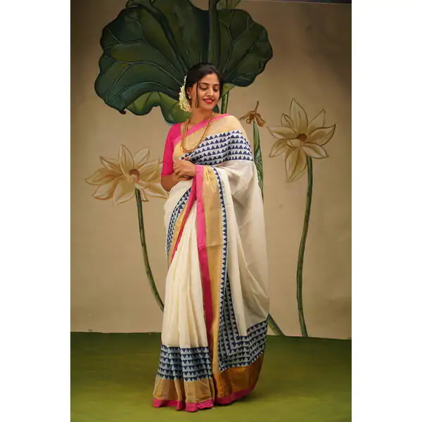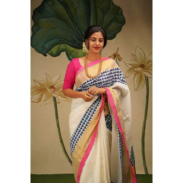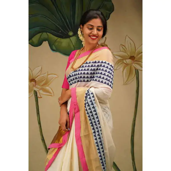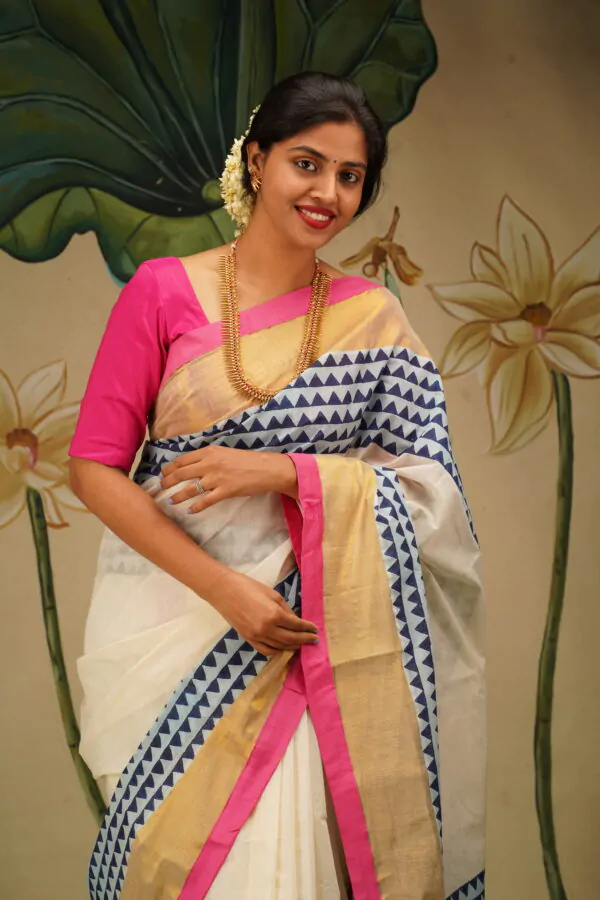 This regal Gold kasavu saree is blockprinted with geometric patterns . The border has bright semi raw silk rani pink fabric at the edge to give a festive look. This captivating print in indigo is lent oomph with gold zari adds opulence of the saree.