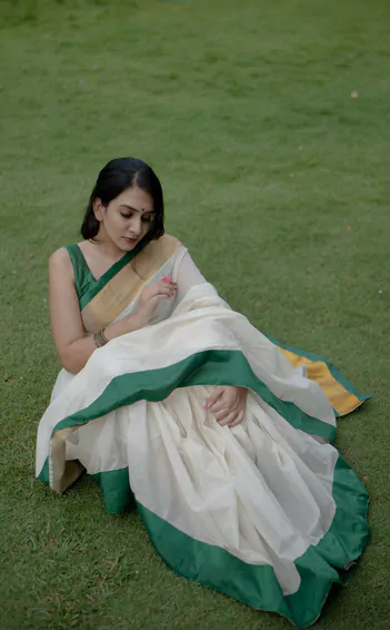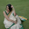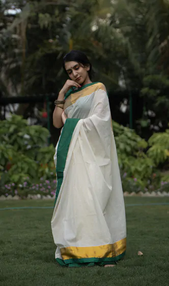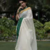 This pure cotton kasavu gold zari has beautiful raw silk border through out the saree. Bright green raw silk fabric has been used for piping on one side and the other side raw silk green fabric has been stitched through out the saree which gives two border look for the saree.