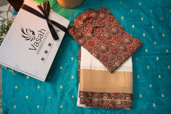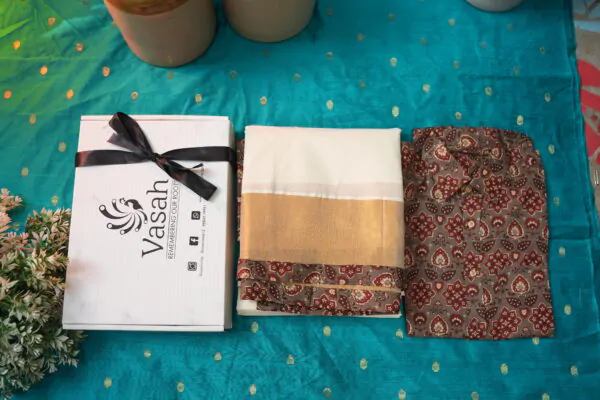 The men shirt feature a classic ajrakh pattern paired with a traditional golden kasavu saree with the ajrakh border— a simple, serene look that honors Kerala’s heritage.