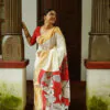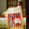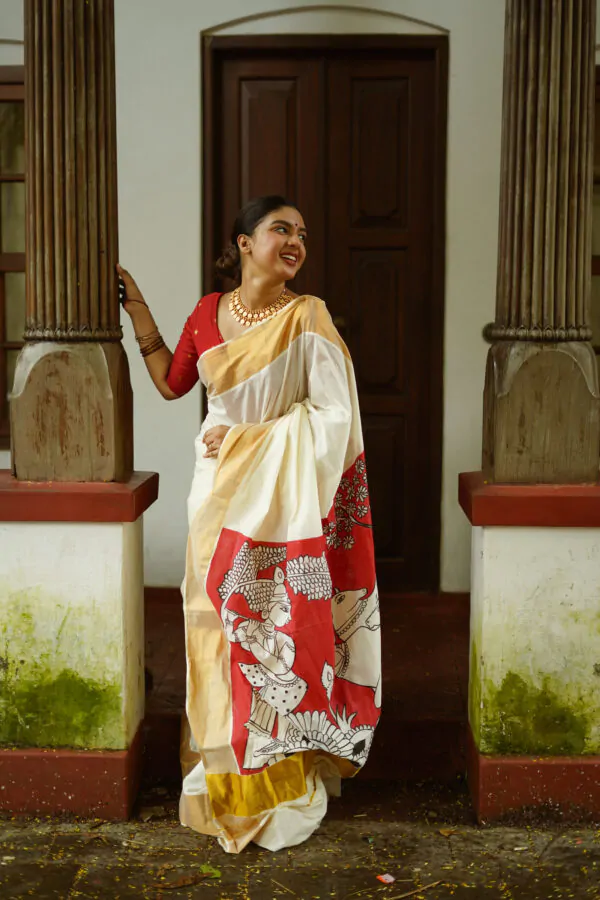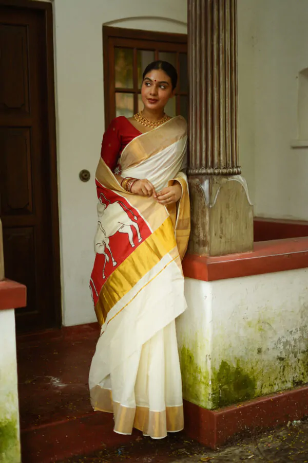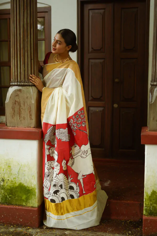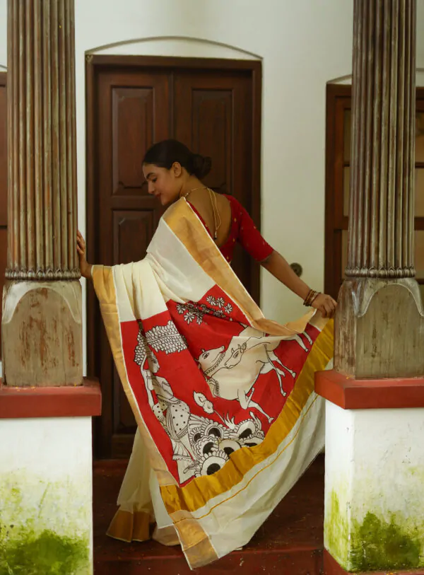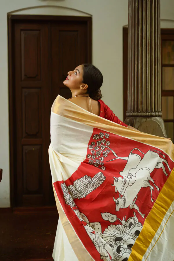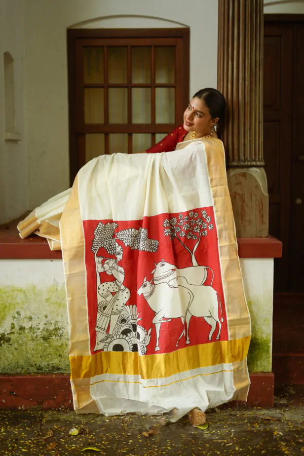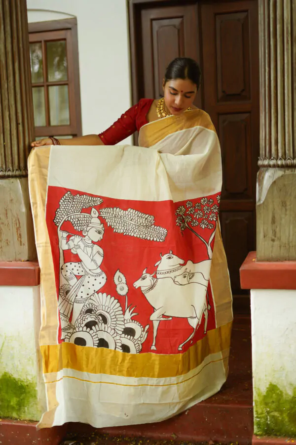 Discover the elegance of the Vasah India’s Kerala Cotton Hand Painted Saree where Krishna and the cow, which was inspired by pichawi painting. It’s a Kerala saree went all the way to North India Rajasthan to get it painted, so it’s even more special.